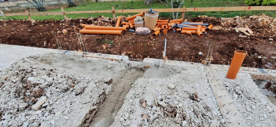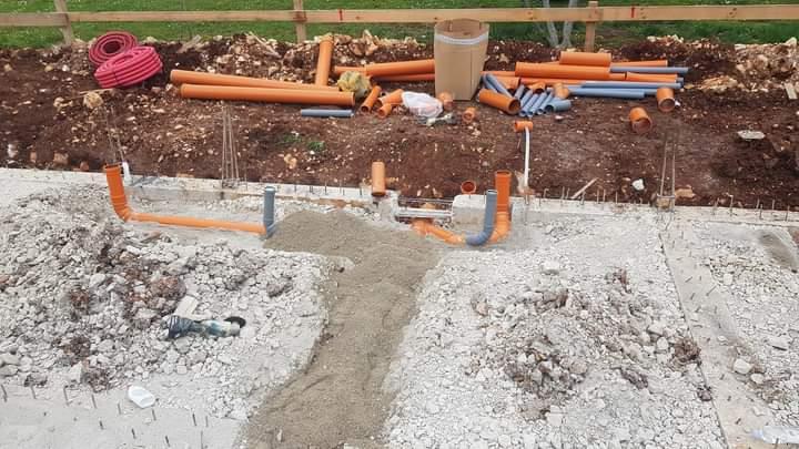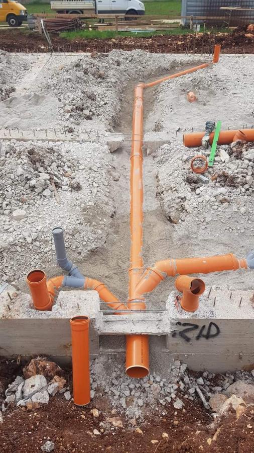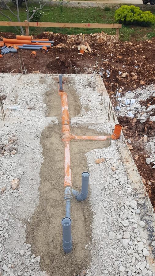 Pravilno postavljanje temeljne kanalizacije: prvo se odrade temelji,nadtemelji i nasip zatim vodoinstalater ocrta kanale za iskop,bagerista napravi iskop kanala kad je iskop gotov stavlja se posteljica sitnog pijeska,ugraduju se naranđaste cijevi takozvane sn4 one trpe težinu jer su znatno skuplje i kvalitetnije. Pripremaju se (grananje) izvodi za vertikale,prizemno kupatila i kuhinja na pozicije vc školjki ,odzrake i priprema za sitne odvode. Zatim se cijevi zatrpaju sitnim pijeskom radi zaštite, odradi se i dovod vode za ulaz u kuću većinom u kotlovnici. Nakraju se stavlja mreža i betonira mrtva ploča tako se radi školski i po propisima.