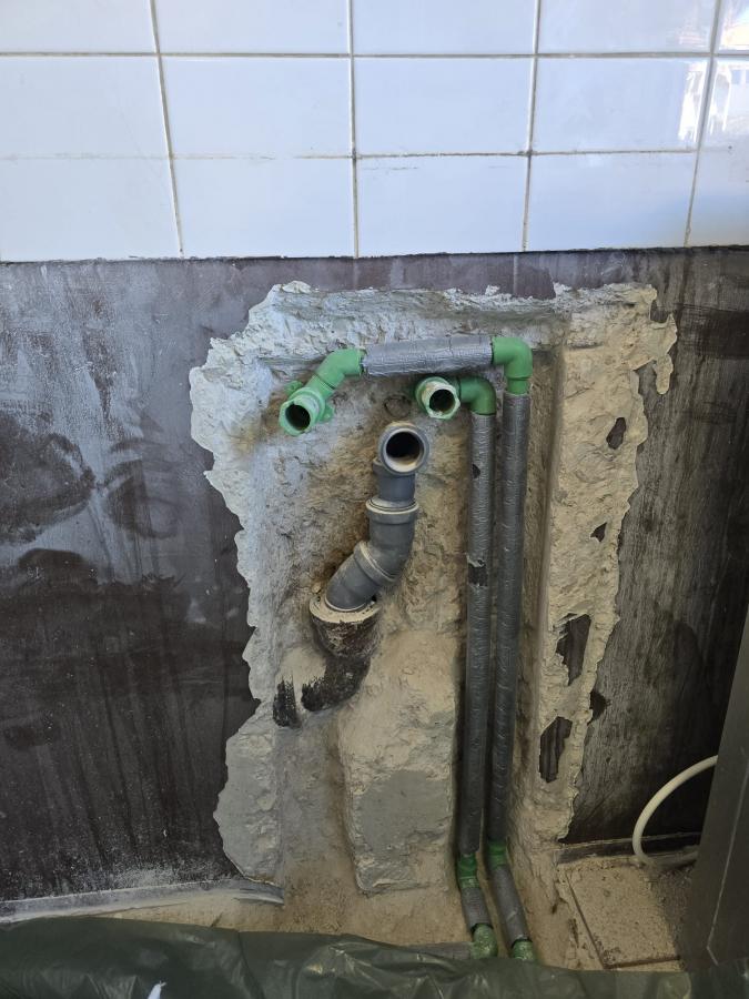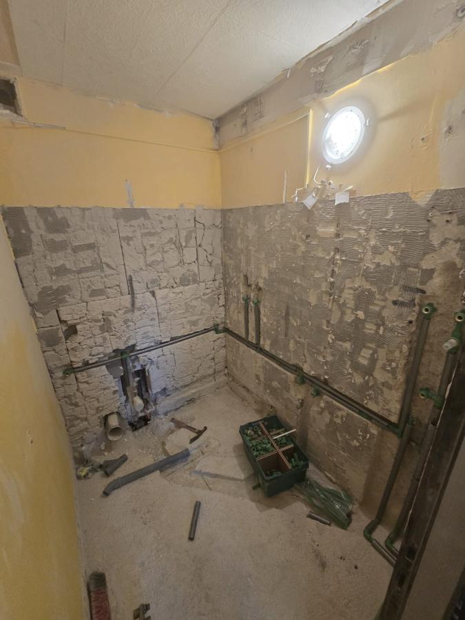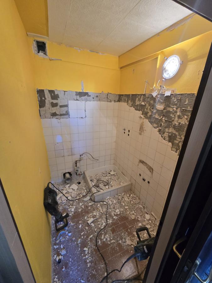- demontaža komplet starih sanitarija, skidanje komplet keramike sa zidova, desno na vrhu anuliranje rezanje starih cijevi, štemanje kanala za novu instalaciju dovoda tople vode, hladne vode i odvoda na pozicije tuša, wc školjke, umivaonika bojlera i kuhinje.
