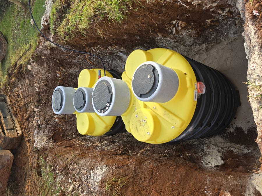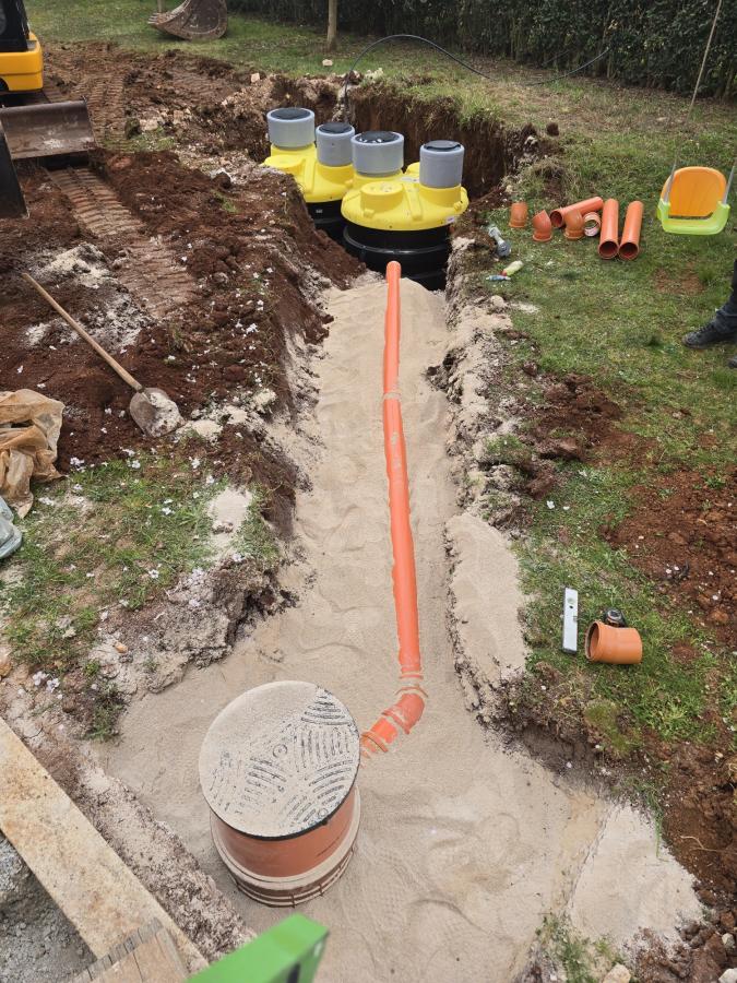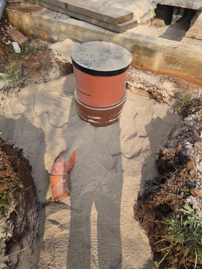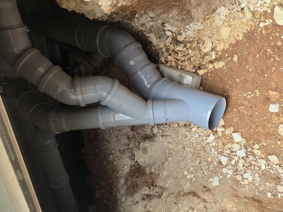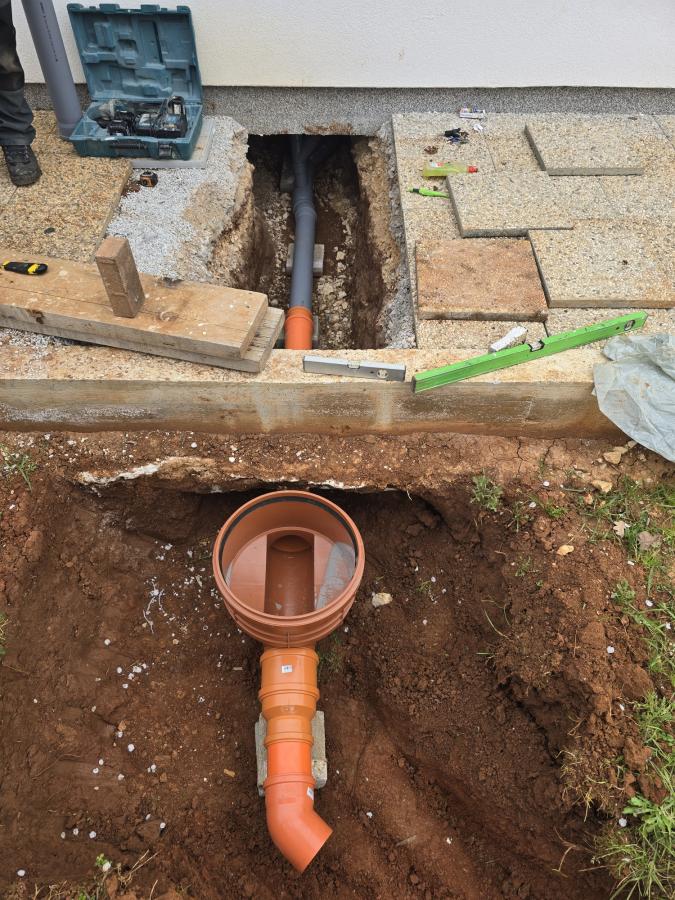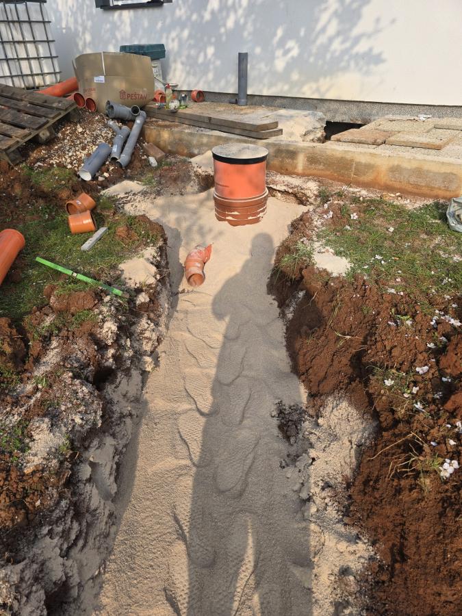 Ispod kuće smo pokupili sve odvode prespojili ih i preusmjerili na drugu stranu kuće zatim smo sa odvodima isli preka eko sepitički sa sn4 cijevima,ugradili šaht,postavili eko septičke i pospajali s time da smo prije napravili posteljicu pijeskom i zatrpali odvodne cijevi pijeskom fiksirali.